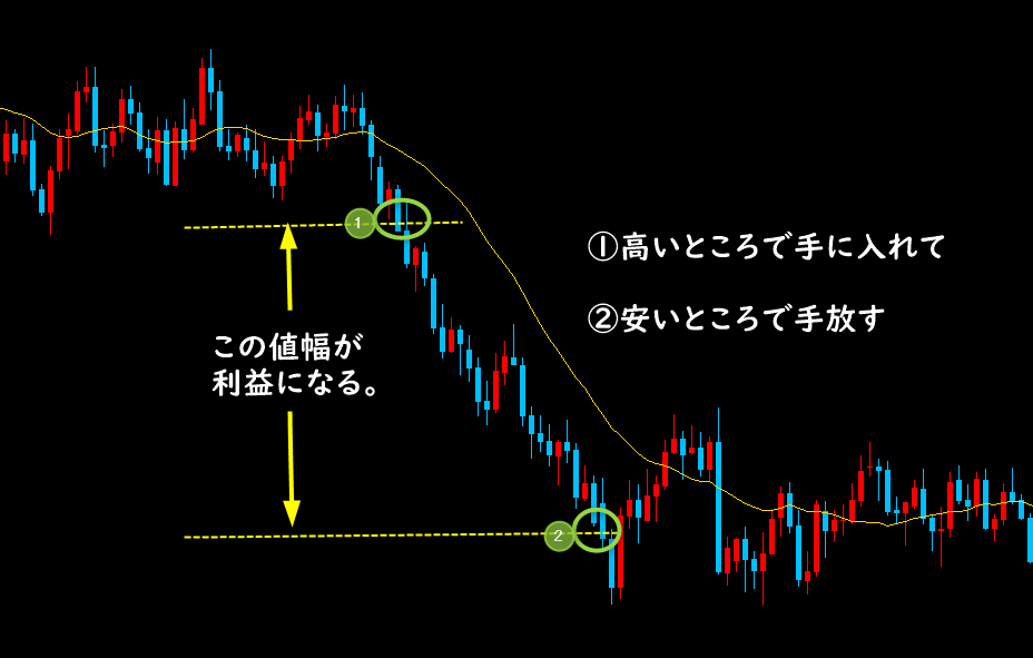 この逆で、高い価格で空売りして安い価格で決済する。その差額でも利益を出すことができます。